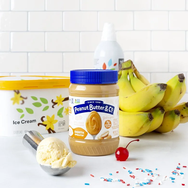 Ice cream container, peanut butter jar, bananas, whipped cream can, ice cream scoop with vanilla ice cream, cherry, and sprinkles on a white surface.