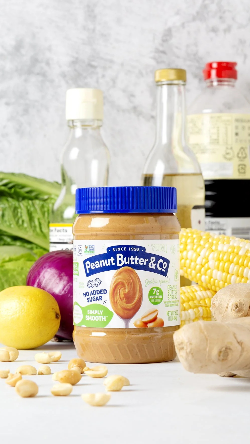Jar of Peanut Butter & Co. Simply Smooth peanut butter with ingredients like ginger, corn, peanuts, lemon, onion, lettuce, and assorted bottles in the background.