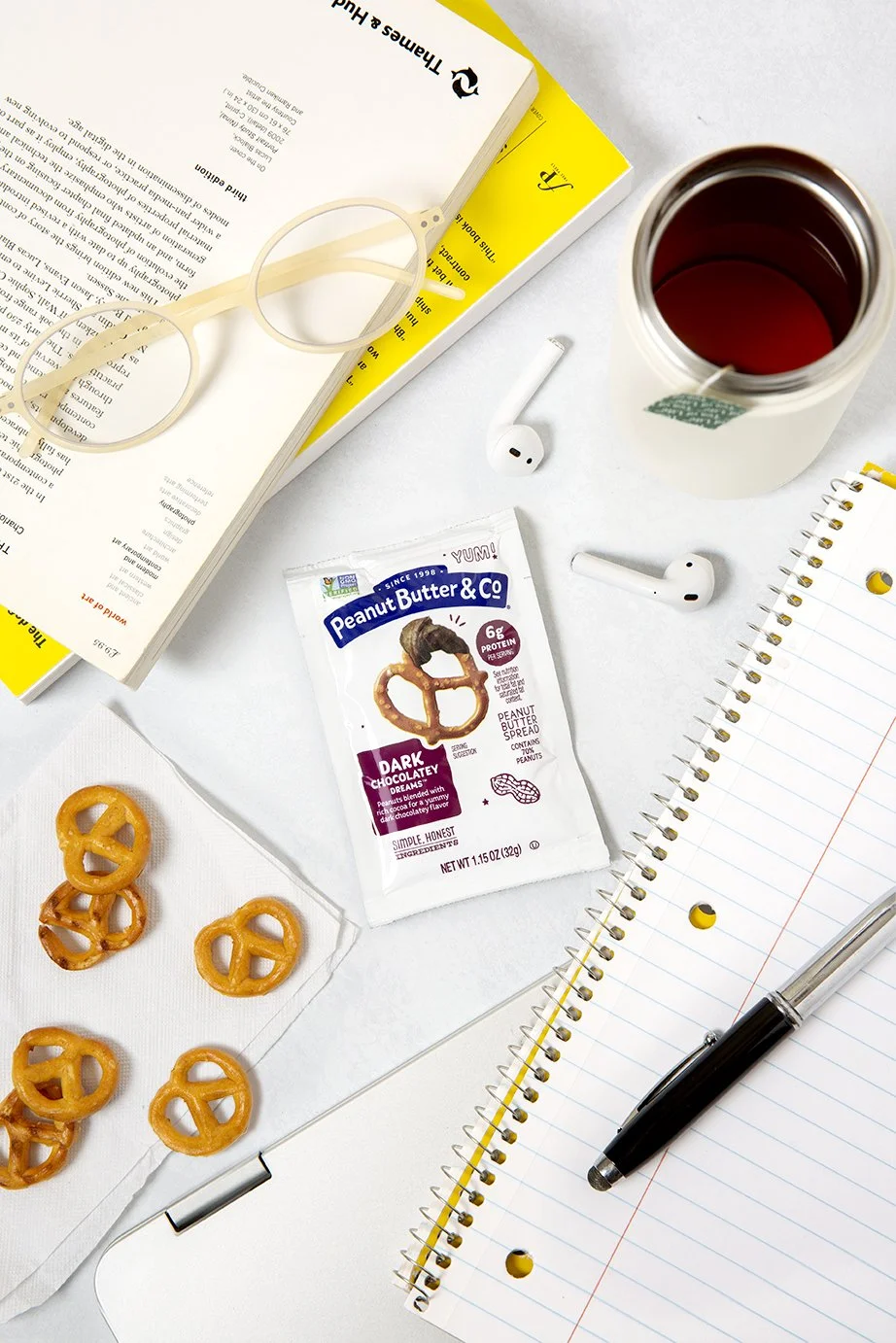 Overhead view of a study setup including a packet of Peanut Butter & Co. dark chocolatey peanut butter, pretzels on a napkin, eyeglasses on an open book, a thermal mug with tea, earphones, and a pen on a spiral notebook.