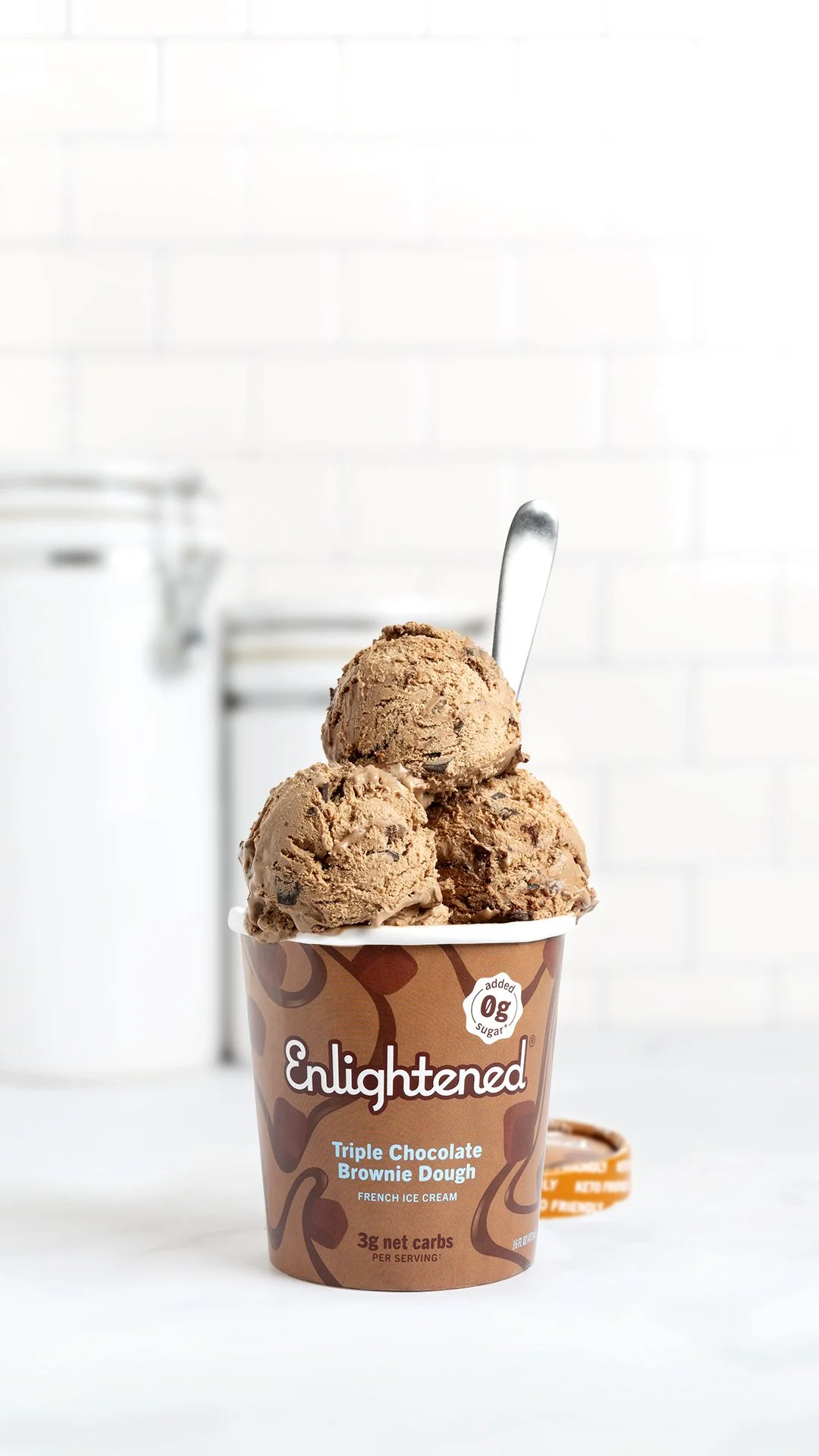 Three scoops of Enlightened Triple Chocolate Brownie Dough ice cream in a brown container with a silver spoon, on a white countertop.